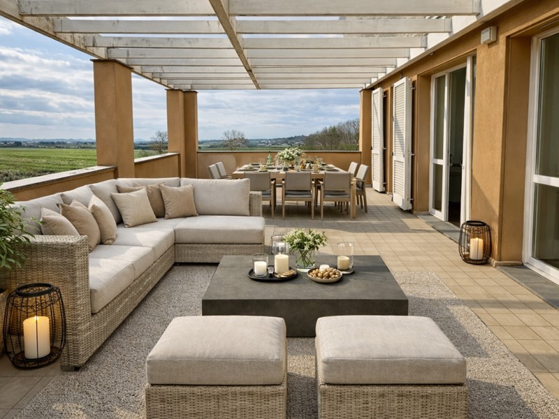 La terrazza è ideale per cene estive, momenti di relax al sole o aperitivi con vista sul verde.