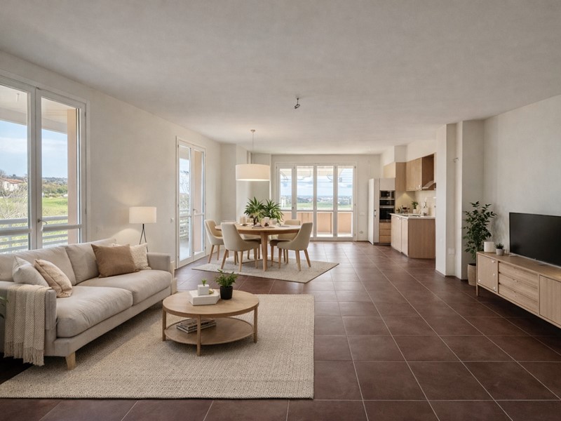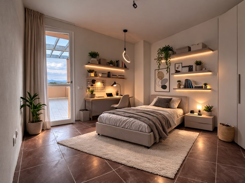 L’abitazione si apre su un ampio soggiorno-pranzo con angolo cottura, luminoso e conviviale, con accesso diretto alla grande terrazza di circa 40 mq, oltre a un ulteriore balcone coperto, perfetto anche nelle mezze stagioni.