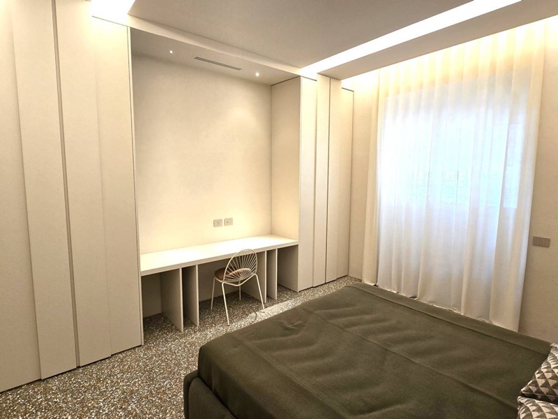 La zona notte è composta da una spaziosa camera matrimoniale con armadiature e postazione studio integrate. Il bagno, di generose dimensioni e dal design contemporaneo, è dotato di vasca, ampia doccia walk-in e vano wc separato.