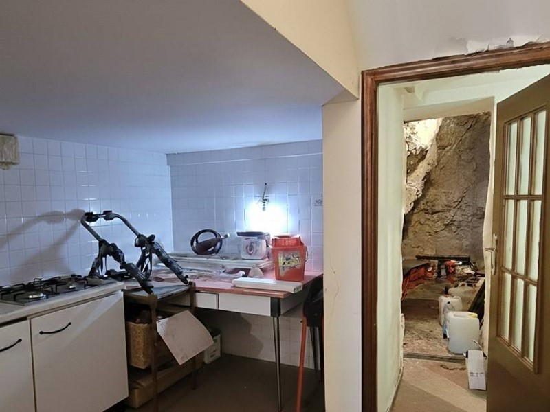 Al piano terra veniamo accolti da un ingresso-taverna con angolo cottura e locale tecnico all'interno di una caratteristica grotta scavata nella roccia.