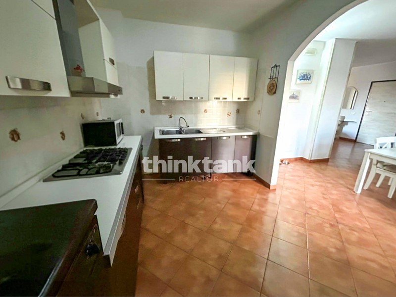 La cucina adiacente, comoda e funzionale, garantisce praticità nella gestione quotidiana, mantenendo una disposizione razionale degli ambienti.