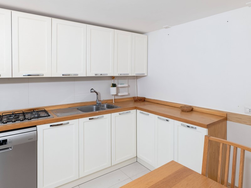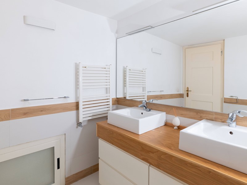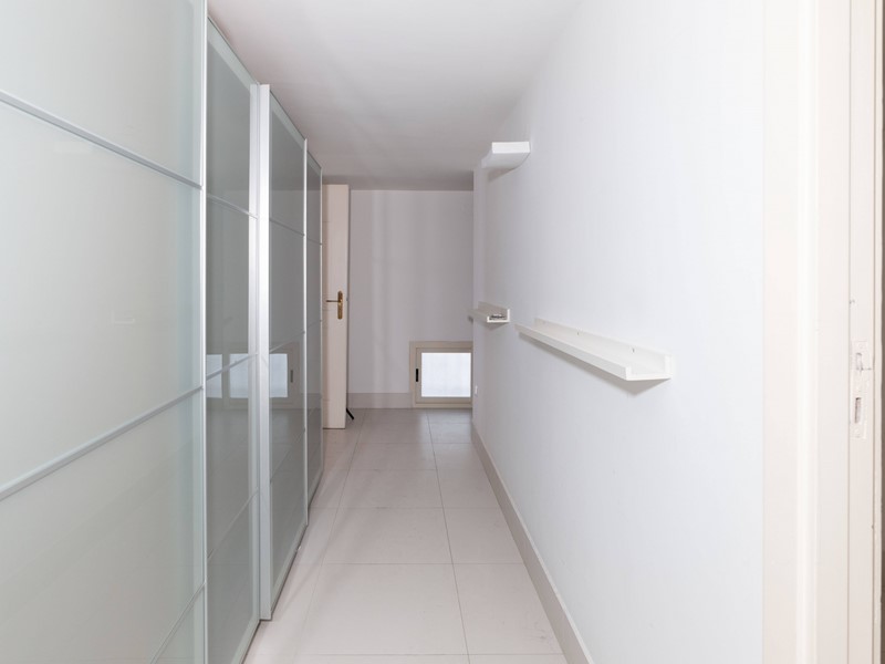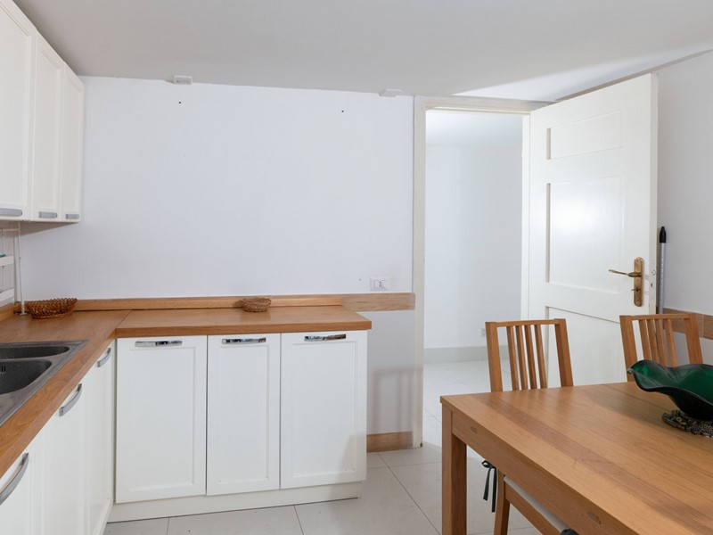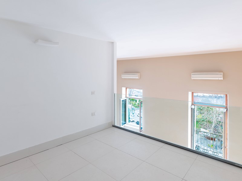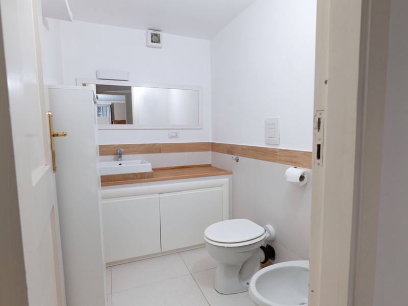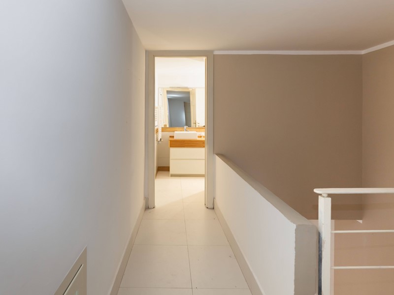 Dal disimpegno si accede anche a una cucina abitabile e a un bagno, mentre una scala interna conduce al piano superiore dove si sviluppa la zona notte, composta da 2 camere da letto, un bagno con vasca e una raffinata stanza armadio con bagno privato.