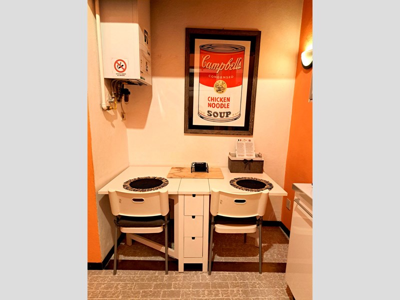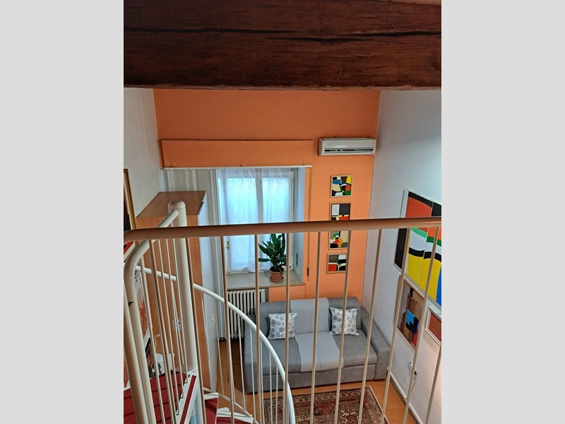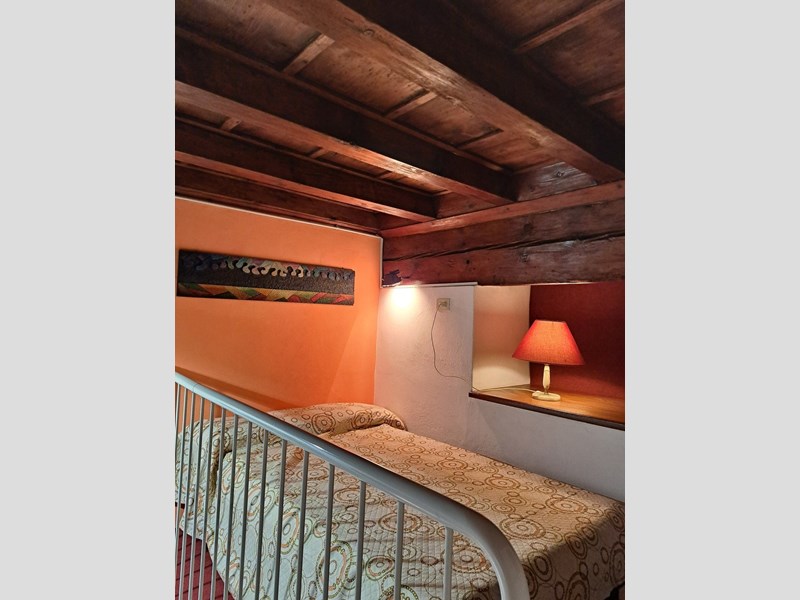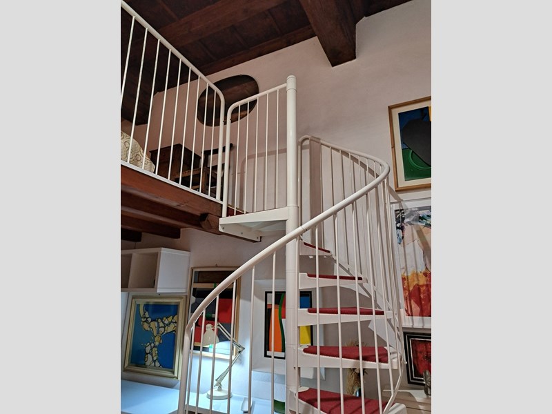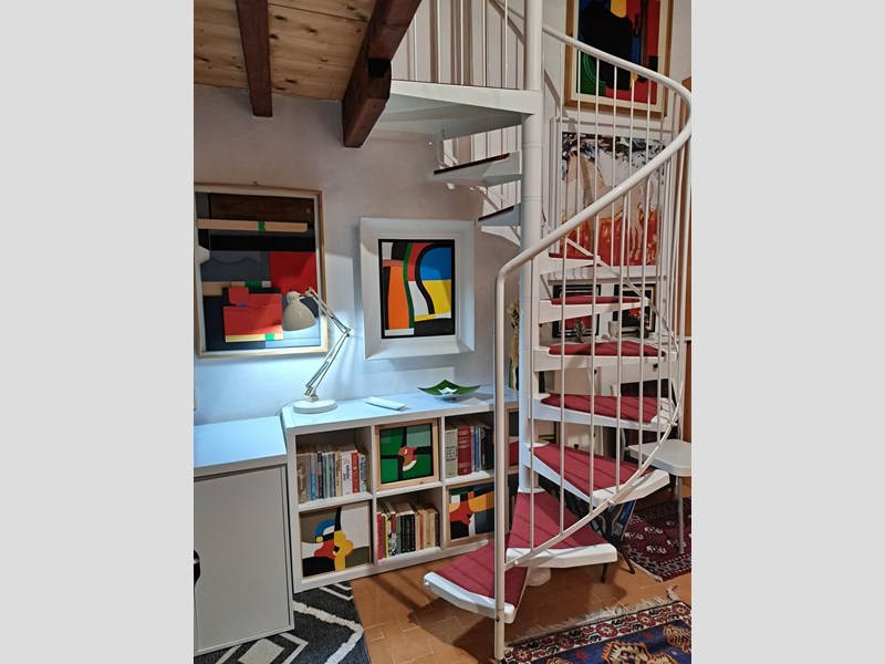 La zona giorno è luminosa e accogliente, caratterizzata da tonalità calde e da una parete artistica che dona personalità all’ambiente. Una scala a chiocciola bianca collega la zona giorno al soppalco, dove si trova la zona notte raccolta, impreziosita da travi antiche a vista.