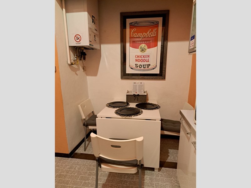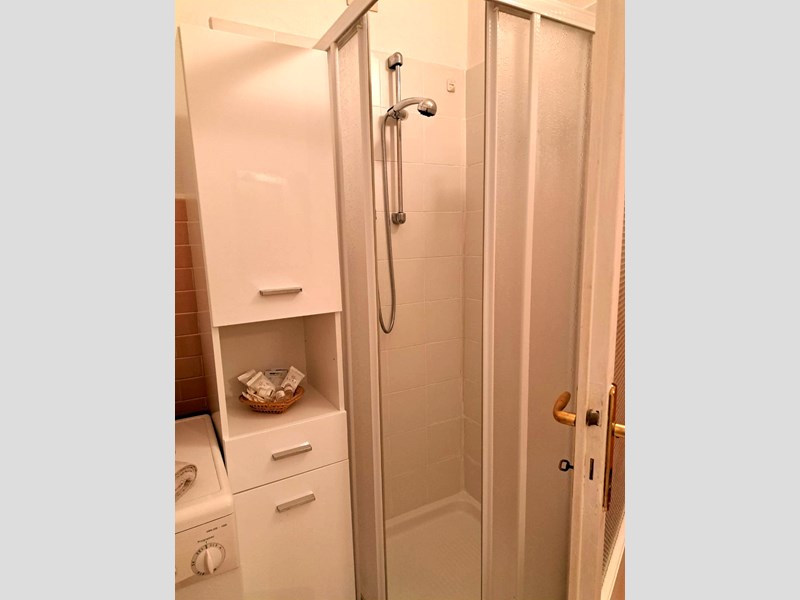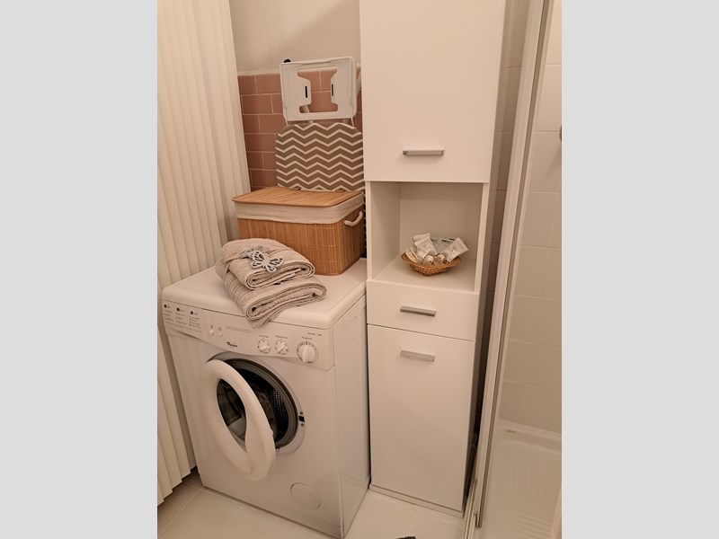 L’ingresso si apre sulla cucina abitabile, funzionale e ben organizzata. Un corridoio conduce al bagno finestrato con box doccia, dotato di angolo lavanderia con lavatrice e armadiatura.