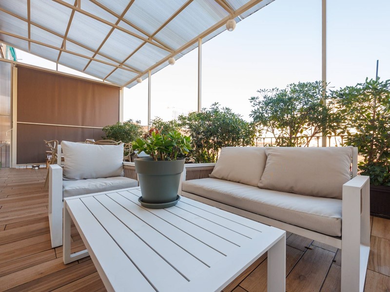 ingresso, soggiorno/living con zona pranzo e cucina a vista, due camere matrimoniali, bagno e un meraviglioso terrazzo corredato di copertura e completamente attrezzato. Conclude la proposta una grande cantina al piano interrato.