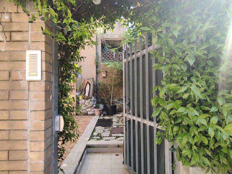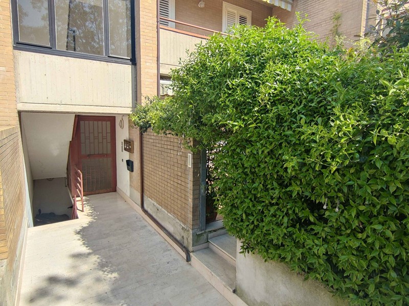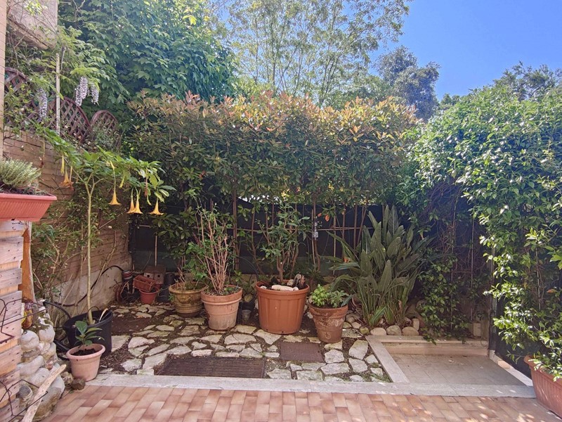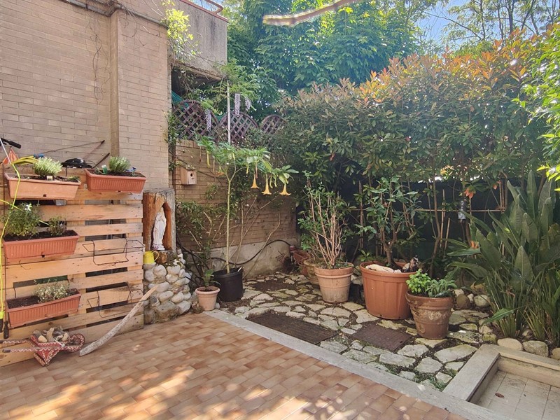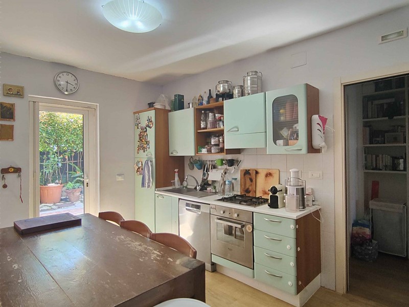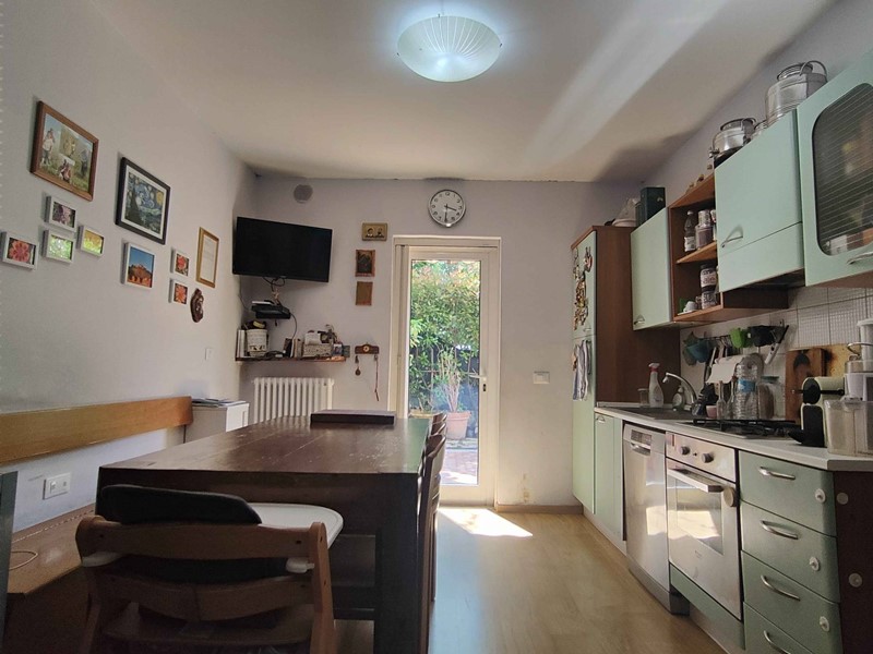 L'alloggio, completamente ristrutturato nel 2010 per modificare la distribuzione interna dei locali, è così composto: ingresso indipendente da corte privata/giardino, cucina abitabile, disimpegno, due camere (una matrimoniale e una singola), un ripostiglio/cabina armadio ed un bagno con doccia e finestra. Completano la proprietà due corti private, una esposta ad est (in corrispondenza delle camere) e l'altra ad ovest (adiacente la cucina) per complessivi mq 70 circa, un fondaco di mq 7 ed un garage di mq 17, entrambi posti al piano seminterrato dello stesso stabile.