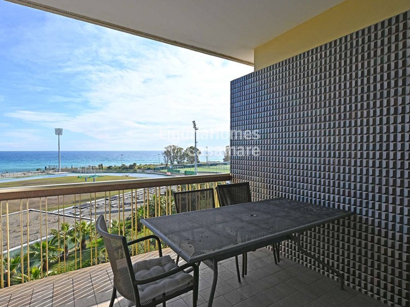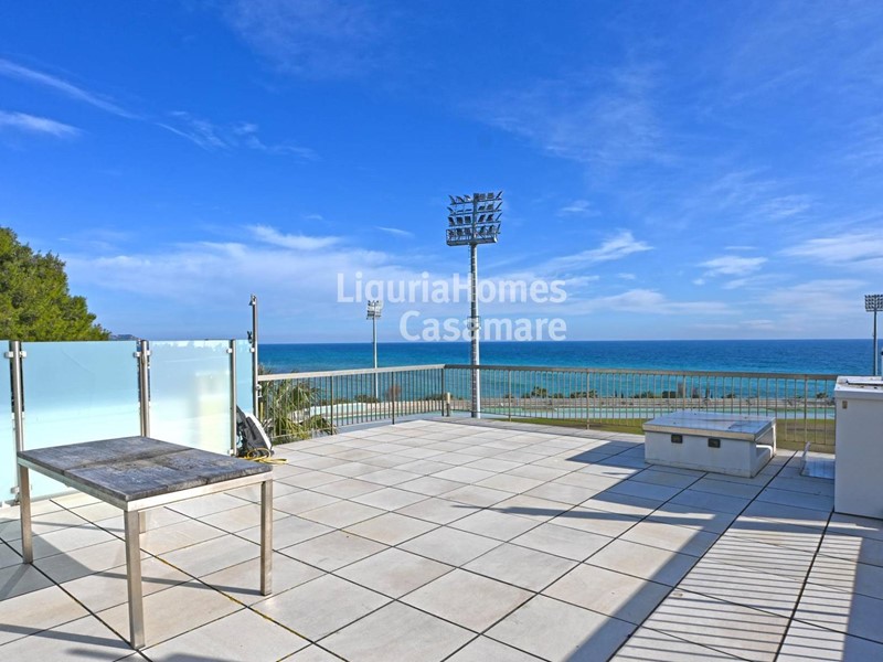 In posizione esclusiva fronte mare a Sanremo, direttamente a ridosso della pista ciclabile e delle spiagge, appartamento trilocale situato allultimo piano, impreziosito da una spettacolare terrazza sul tetto di proprietà di oltre 80 m2 con incantevole vista aperta sul mare.