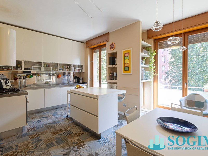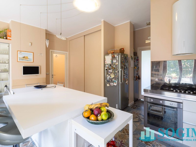 La cucina abitabile, completamente arredata, è uno degli spazi più curati della casa: rivestita con la raffinata pavimentazione Azulej di Mutina, vincitrice di importanti premi di design, è pensata per accogliere la vita quotidiana con funzionalità ed eleganza.