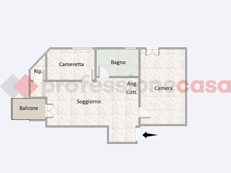 L'appartamento è composto da: ingresso, soggiorno con angolo cottura e balcone panoramico, camera da letto matrimoniale, cameretta, ripostiglio e bagno.