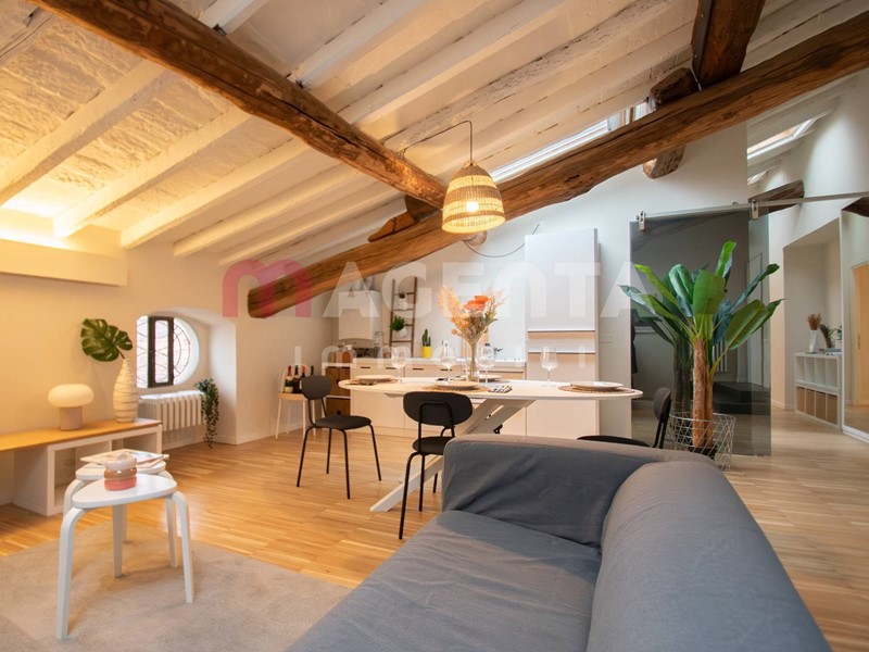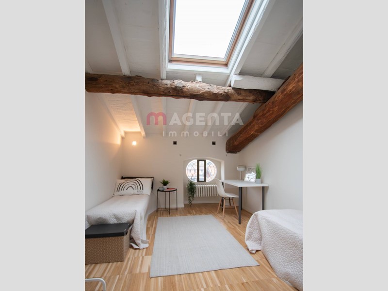 Tutta la proprietà è caratterizzata dalle travi a vista sbiancate e da diversi velux eltettrici, oltre alle finestre che rendono la soluzione estremamente accogliente e luminosa ed è perfetta per accogliere una copia con figli oppure per essere messa a reddito.