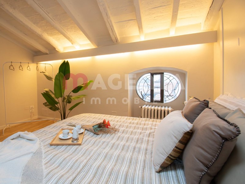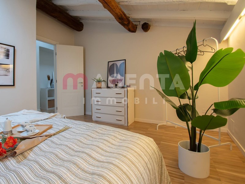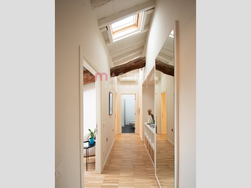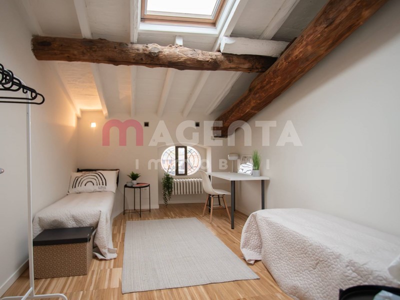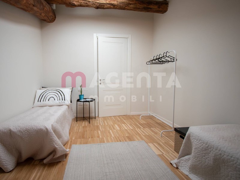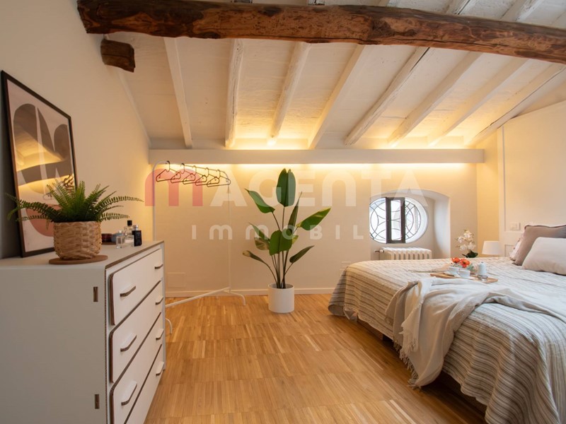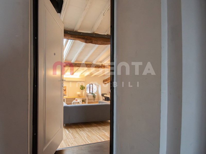 La soluzione si trova al secondo ed ultimo piano all'interno di una corte del' 600 ed ha una superficie di circa 90 metri quadrati ed è costituita da ingresso, soggiorno con angolo cottura, camera matrimoniale, camera singola e bagno.