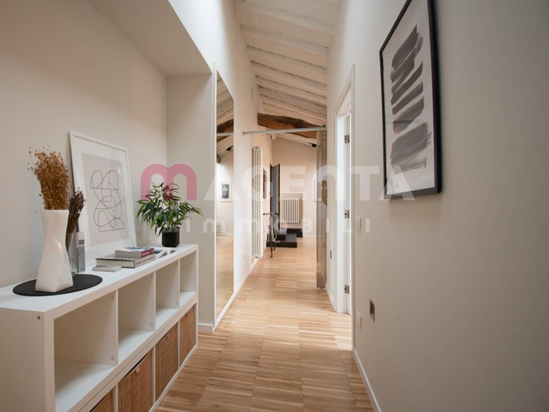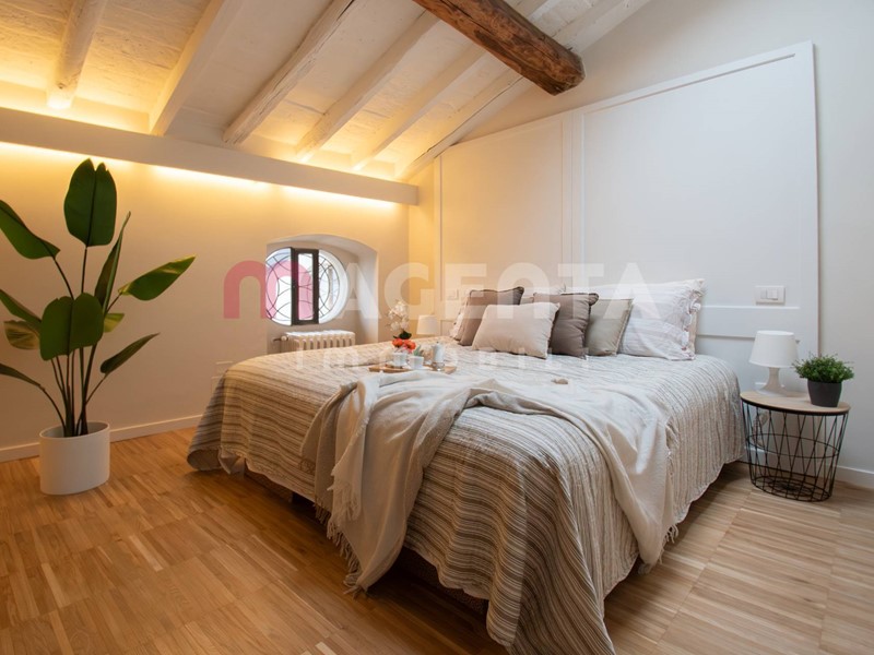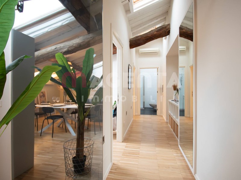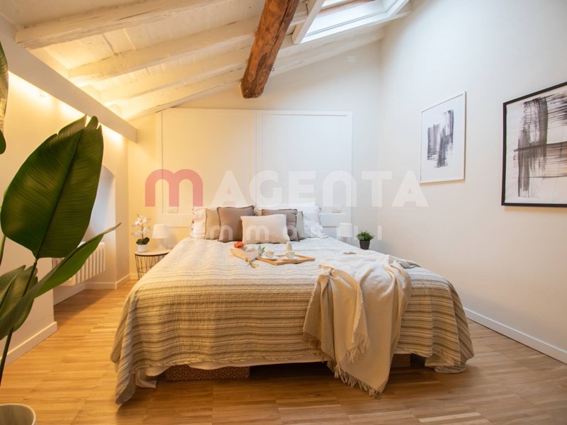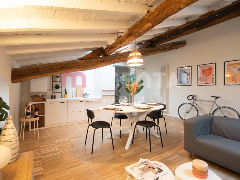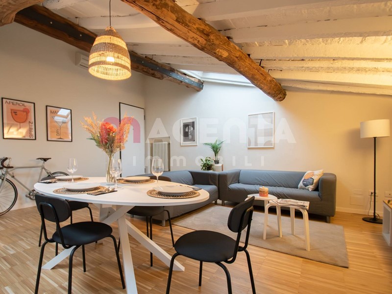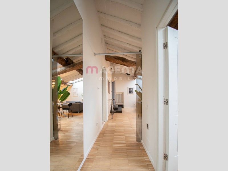 La soluzione si trova al secondo ed ultimo piano all'interno di una corte del' 600 ed ha una superficie di circa 90 metri quadrati ed è costituita da ingresso, soggiorno con angolo cottura, camera matrimoniale, camera singola e bagno.