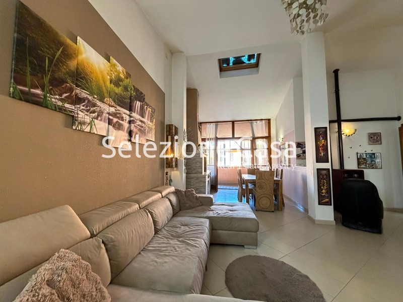 Entrando ti trovi in una zona giorno alta e scenografica, con il soffitto spiovente che sale sopra il soggiorno. Uno spazio raro negli appartamenti moderni che dà respiro, una luce più bella e vera personalità.