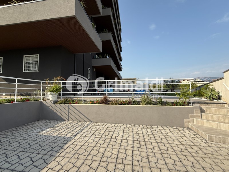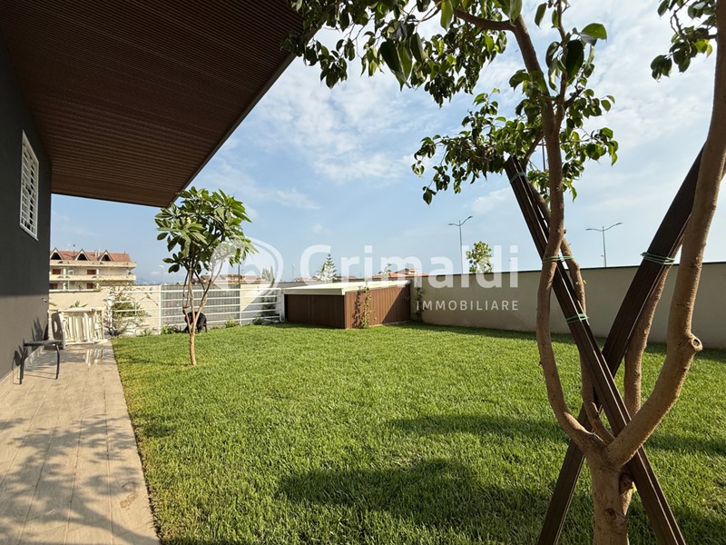 Si apre su un ampio soggiorno con cucina in stile open space, tre camere da letto (una matrimoniale e due singole), due bagni, ripostiglio/lavanderia, due terrazzi e giardino privato di 320 mq.