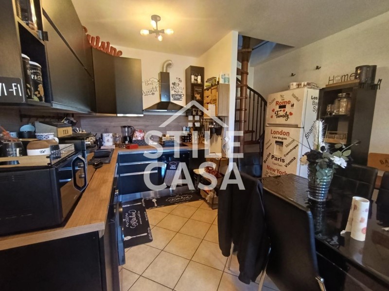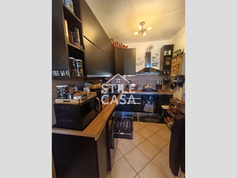la casa è composta da soggiorno con cucina a vista, completamente accessoriata e completa di elettrodomestici, disimpegno, camera matrimoniale, ampia cameretta ad oggi adibita e attrezzata come cabina armado, bagno con doccia finestrato