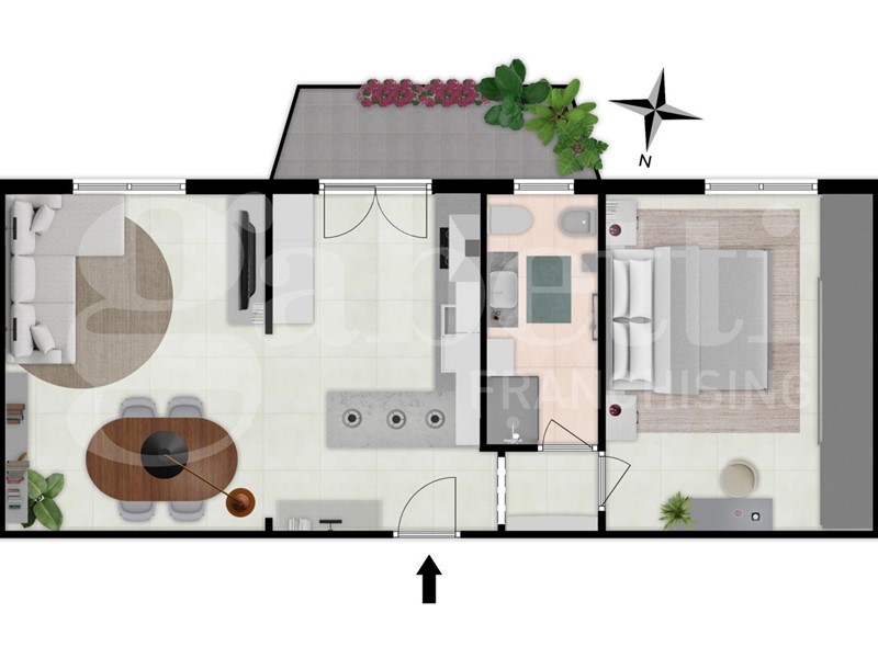 E' composto da ingresso con disimpegno e comoda armadiatura a muro, cucina a vista in stile americano che si apre su un'ampia e luminosa zona living con balcone, bagno finestrato con box doccia e spaziosa camera matrimoniale. Completa la proprietà un'ampia cantina di pertinenza.