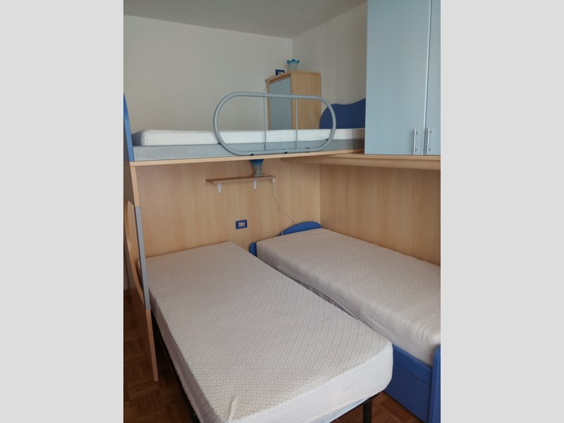 Due camere per 5 posti letto,2 bagni,2 balconi piccolo giardino e posto macchina in box privato.