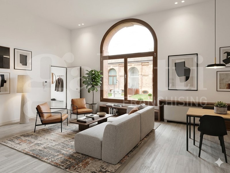 Zona Living Architettonica: Ampio soggiorno con zona cottura caratterizzato da una doppia altezza, ideale per la creazione di un soppalco o un arredo su misura per ottimizzare gli spazi e la vista del fascino senza tempo del chiostro interno del 1900.
