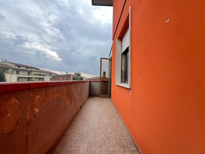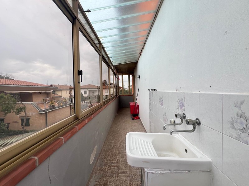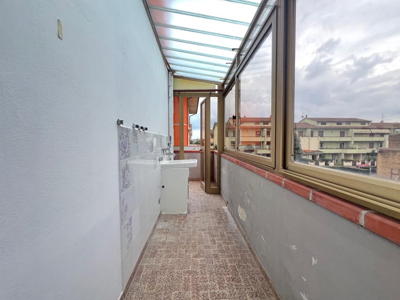 Dal soggiorno si accede al balcone verandato condonato con zona lavanderia, oltre a una parte di balcone scoperta, per un totale di circa 10 mq di sfogo esterno.