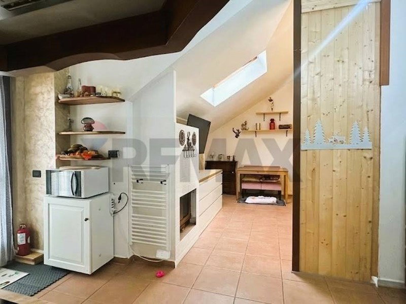 La luminosa zona giorno con cucina a vista è impreziosita da un camino che dona calore e carattere all'ambiente.