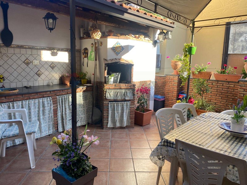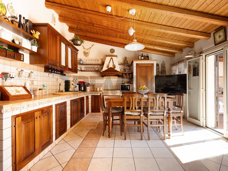 Il salone grazie ad una porta a scomparsa in legno con eleganti vetri sabbiati, viene separato dall'ampia zona pranzo con cucina artigianale su misura con tetto in legno a vista e grandi finestre rendono il tutto luminoso, uscita su terrazzo a livello attrezzato con forno a legna, ideale per momenti conviviali all'aperto,