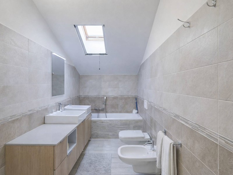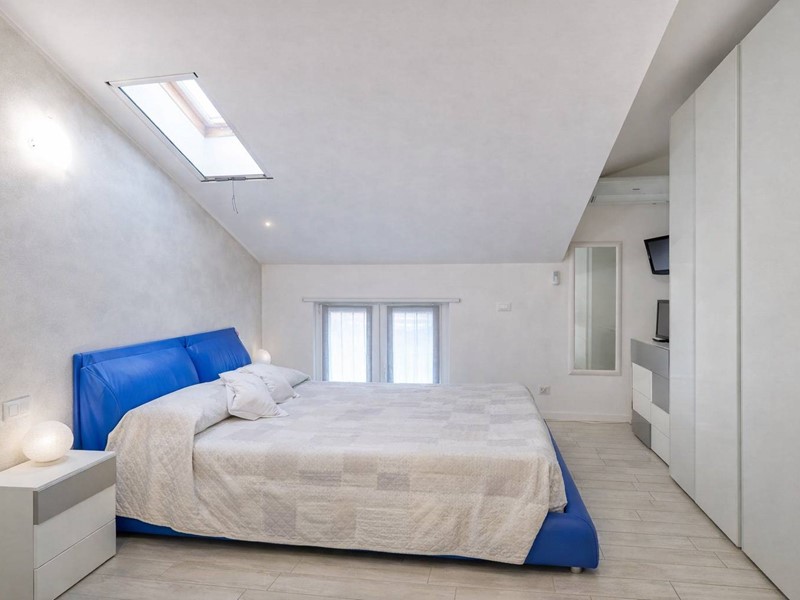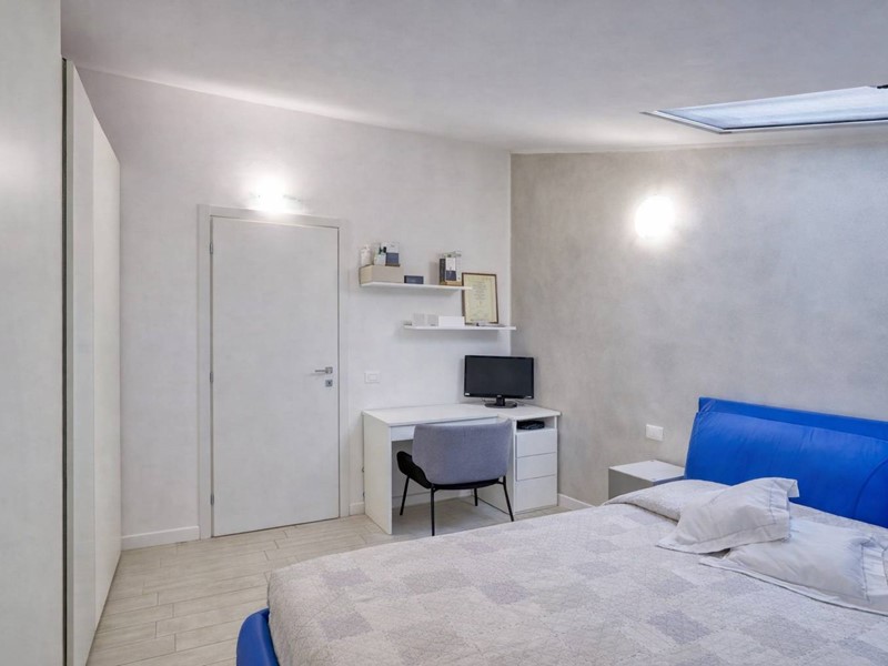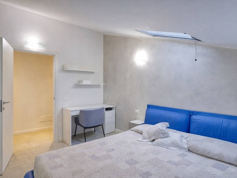 Una scala interna dal design moderno accompagna al piano superiore, dedicato alla zona notte, dove trovano spazio una camera matrimoniale, una seconda camera di taglio generoso e un bagno finestrato dotato di lucernario motorizzato. Anche questo livello beneficia di uno sbocco esterno grazie al balcone accessibile dalla seconda camera.