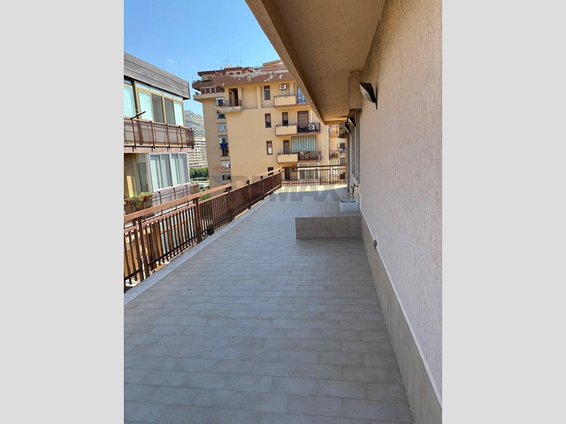 E' dotato di doppio accesso ma tramite il principale si accede direttamente ad un ampio, luminoso e prestigioso salone pari a 4 vani contornato da un ampio e lungo balcone che gira intorno all'intero appartamento sin a culminare in una grandissima terrazza. La quadratura complessiva dell'esterno è di mq 250 dove poter trascorrere le proprie serate. Da un lato con vista mare dal quale si vedono arrivare le navi in porto, dall'altro il meraviglioso Castello Utveggio, tra i più importanti simboli della bella Palermo.