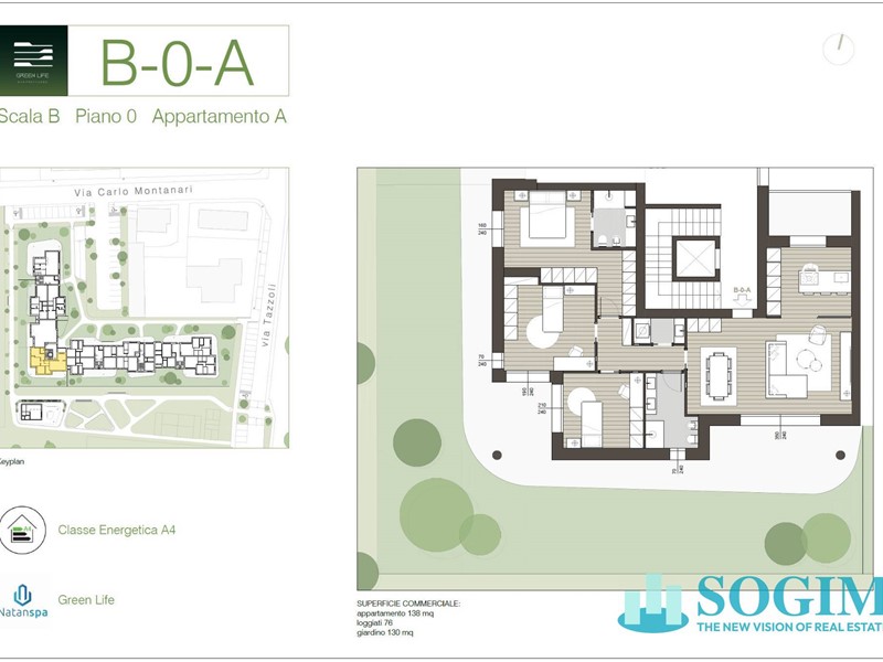 Al piano terra proponiamo appartamento di 138 mq interni suddivisi in zona giorno con cucina a vista o abitabile, tre camere da letto di cui una con cabina armadio, due servizi e la lavanderia. Completano la soluzione la presenza del terrazzo loggiato di 76 mq e il giardino di 130 mq.