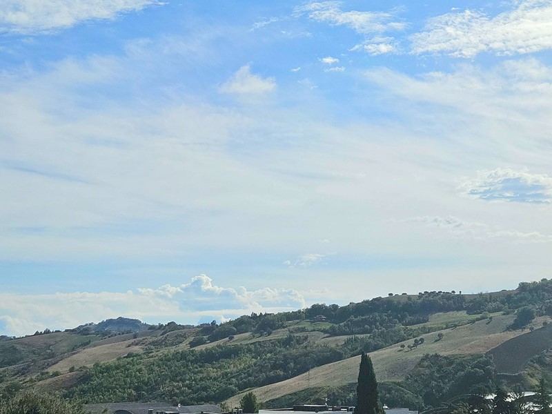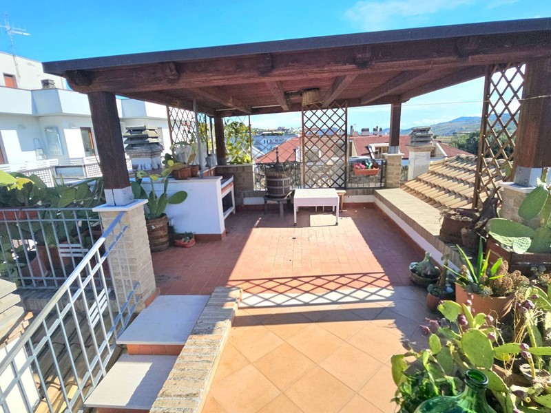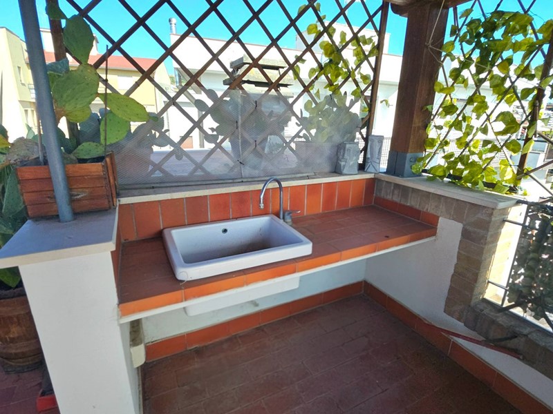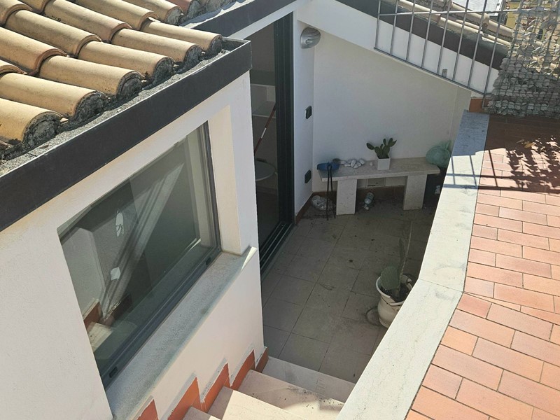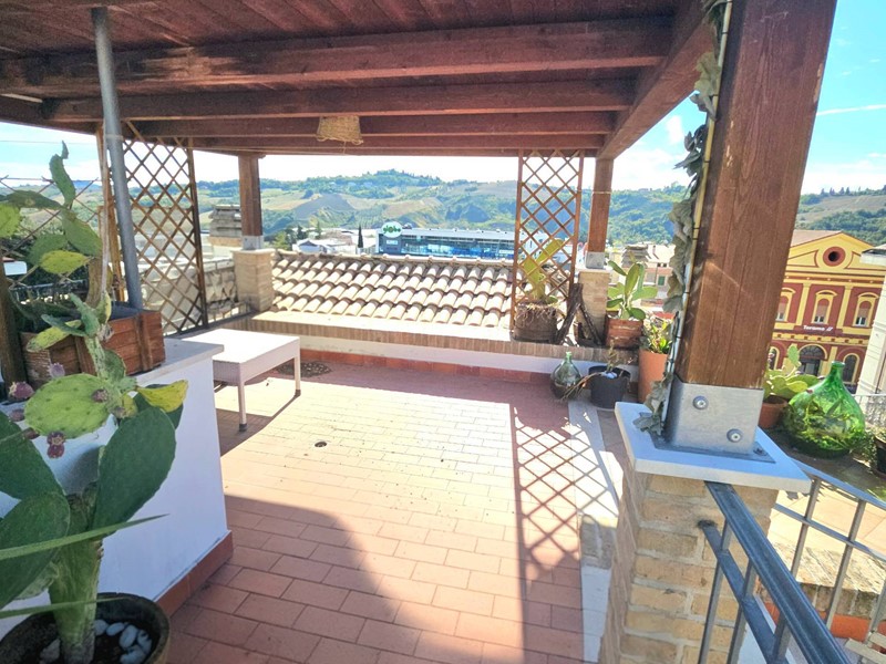 Al piano superiore, coperto da una tettoia in legno e con splendida vista sulla citta' e colline circostanti, si accede tramite una scala posta nel balcone, ad un suggestivo terrazzo panoramico, uno spazio esterno esclusivo, ideale per rilassarsi all'aperto e predisposto come solarium da sfruttare anche come zona barbecue.