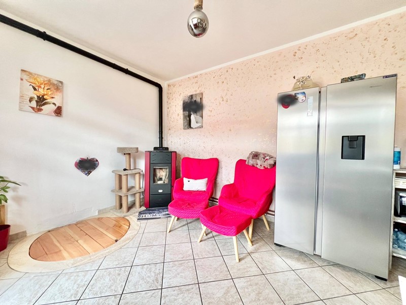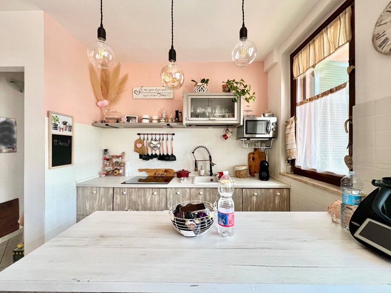 Dal soggiorno si accede al locale accessorio posto al piano S1, dove troviamo uno spazio attrezzato con cucina e caminetto e dal quale è possibile accedere al garage.