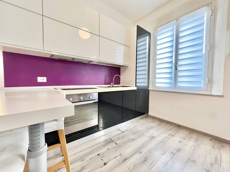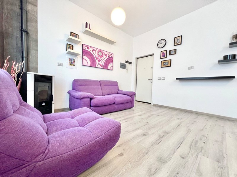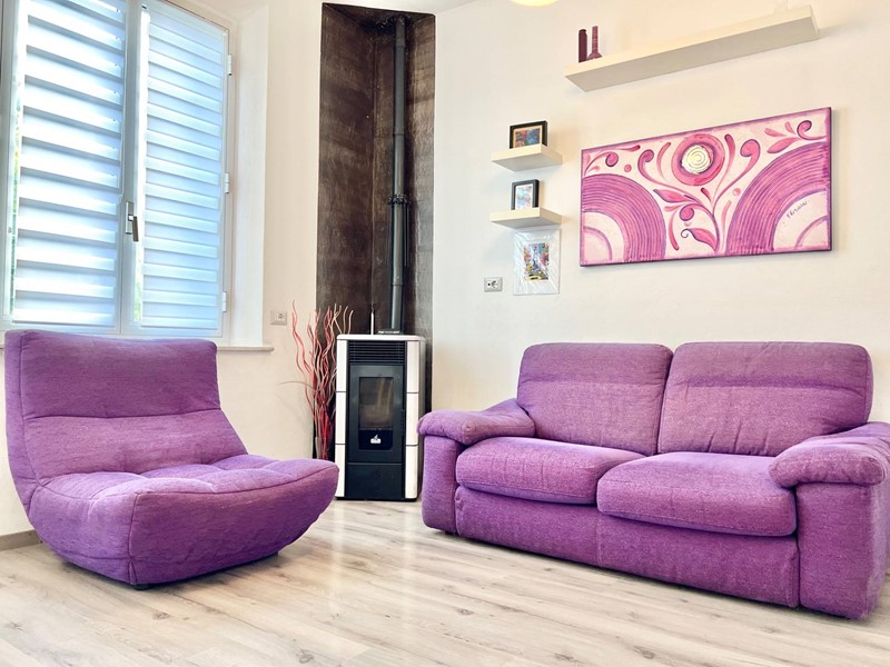 Limmobile si apre su un accogliente open space dove convivono armoniosamente la zona soggiorno e la cucina a vista, arricchita dalla presenza di una stufa a pellet, ideale per creare unatmosfera calda e confortevole nelle stagioni più fredde.