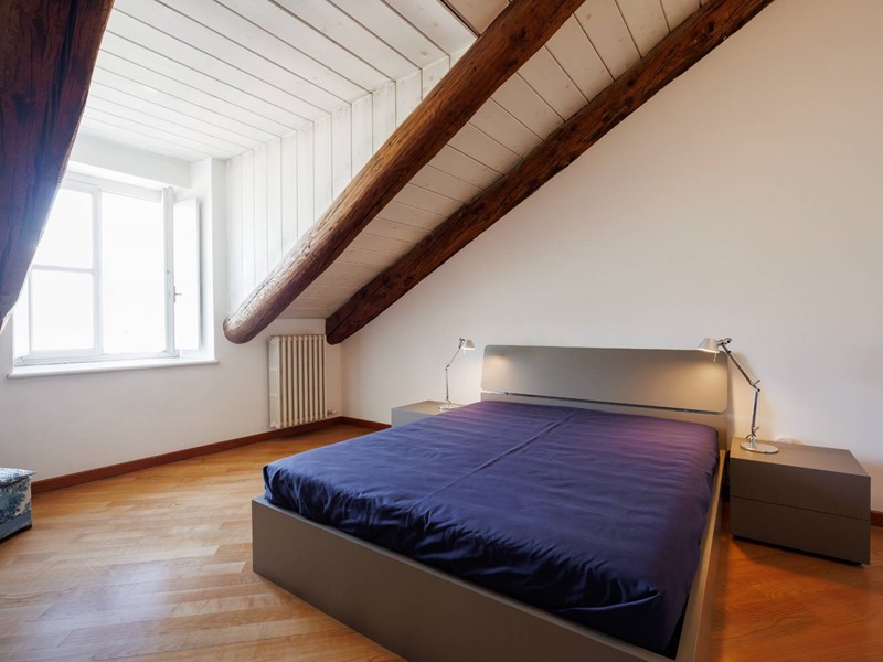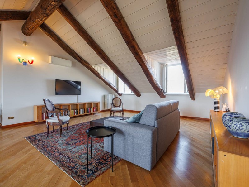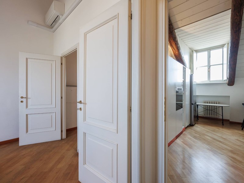 Al quinto piano si trovano lingresso, una scenografica scala in muratura che conduce al piano superiore e una spaziosa camera con anticamera/spogliatoio attrezzata con armadi e divano letto, oltre a un bagno con antibagno. La superficie del piano è di circa 80 mq.
