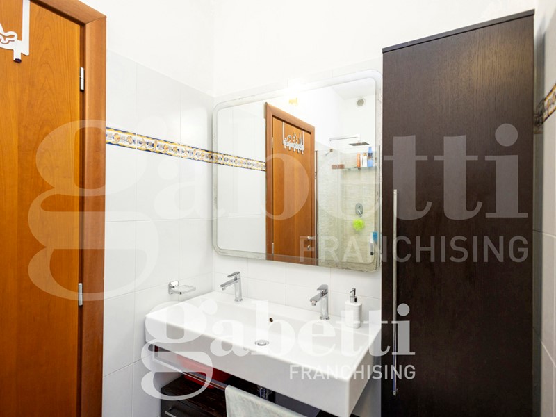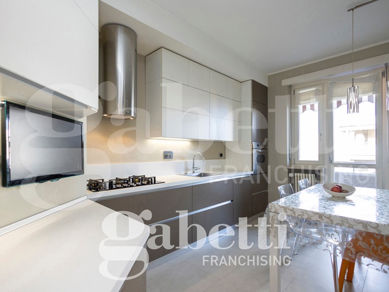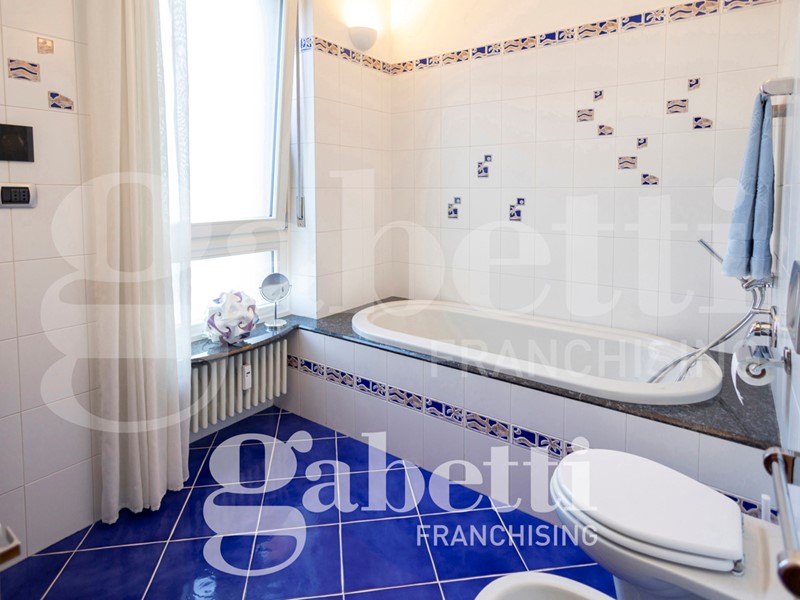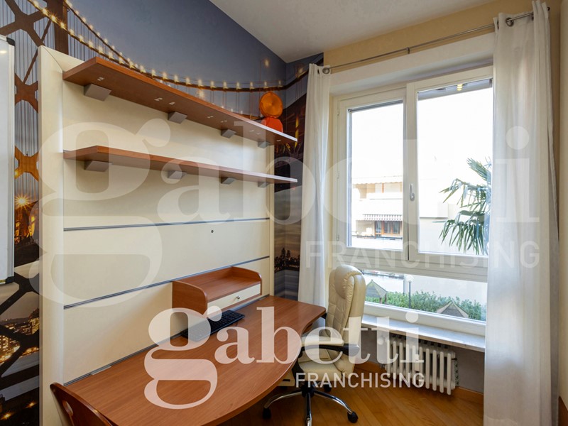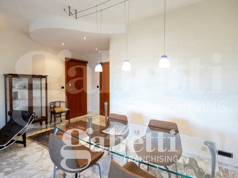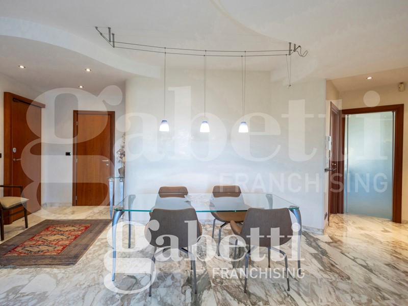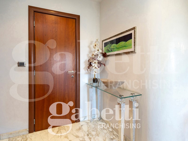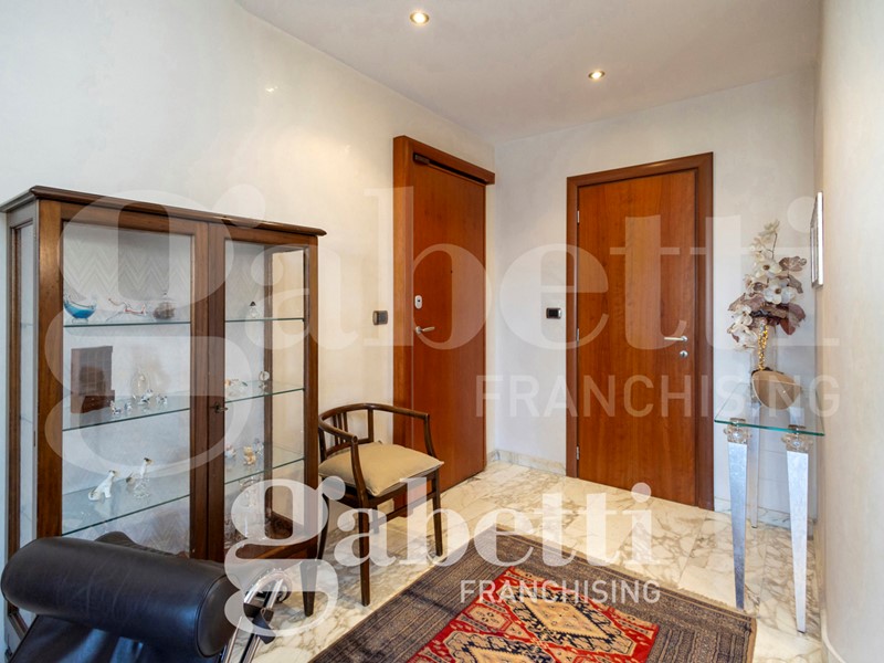 L'alloggio è internamente così composto: ingresso sull'ampio salone, cucina abitabile, quattro camere (di cui una adibita a studio), due bagni (di cui uno cieco), ripostiglio, oltre al terzo bagno adibito a lavanderia e bagno per ospiti. Due balconi profondi.