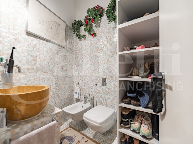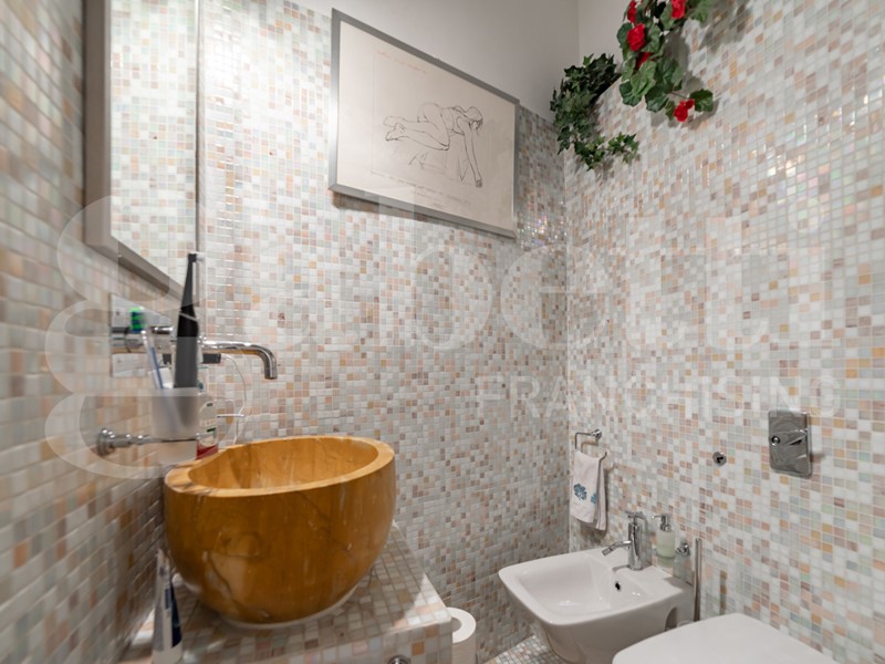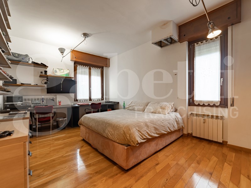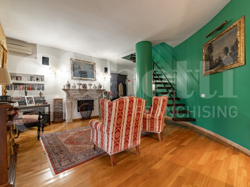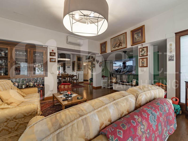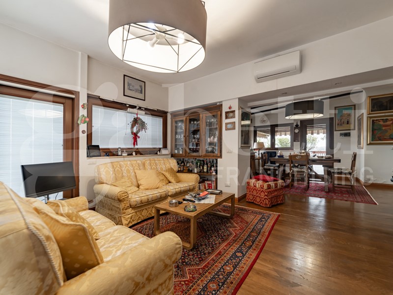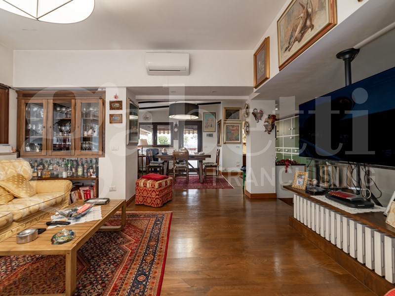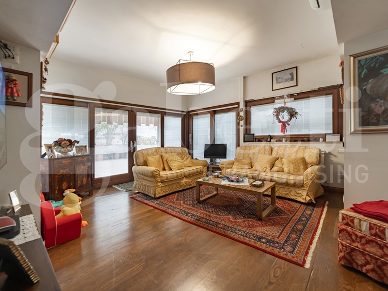 L'ingresso si apre su una grande zona living, luminosa e accogliente, impreziosita da parquet a lisca di pesce presente in tutta la casa, che dona eleganza e continuità agli ambienti.