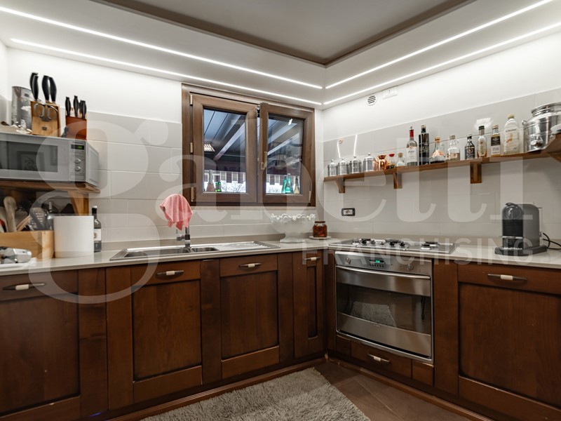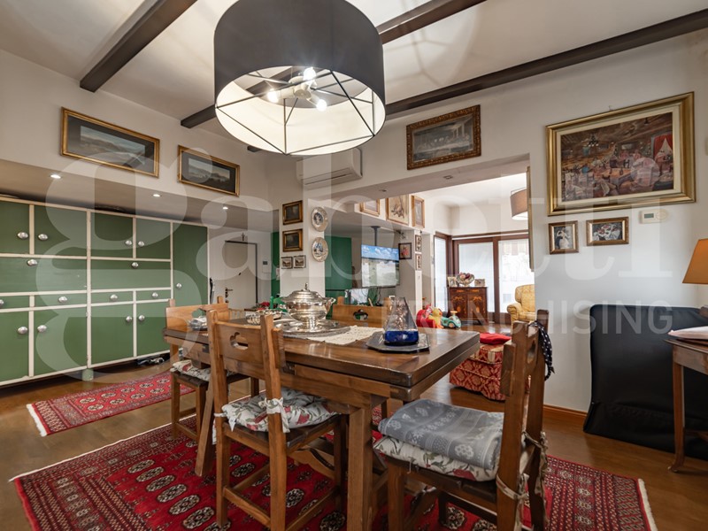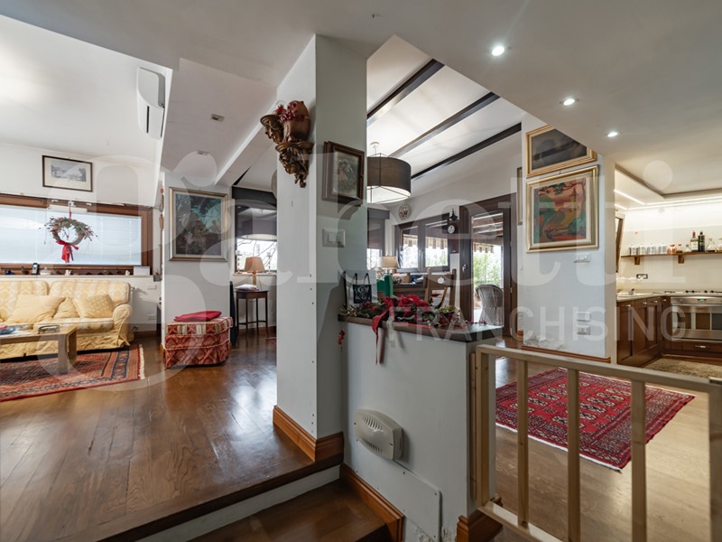 Salendo al piano superiore si apre una accogliente zona giorno composta da sala da pranzo, salotto e cucina, affacciati su due straordinari terrazzi.