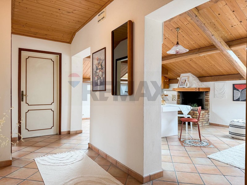 Entrando, si accede a un ampio e luminoso soggiorno con camino e angolo cottura, perfetto per rilassarsi e trascorrere piacevoli momenti in compagnia.