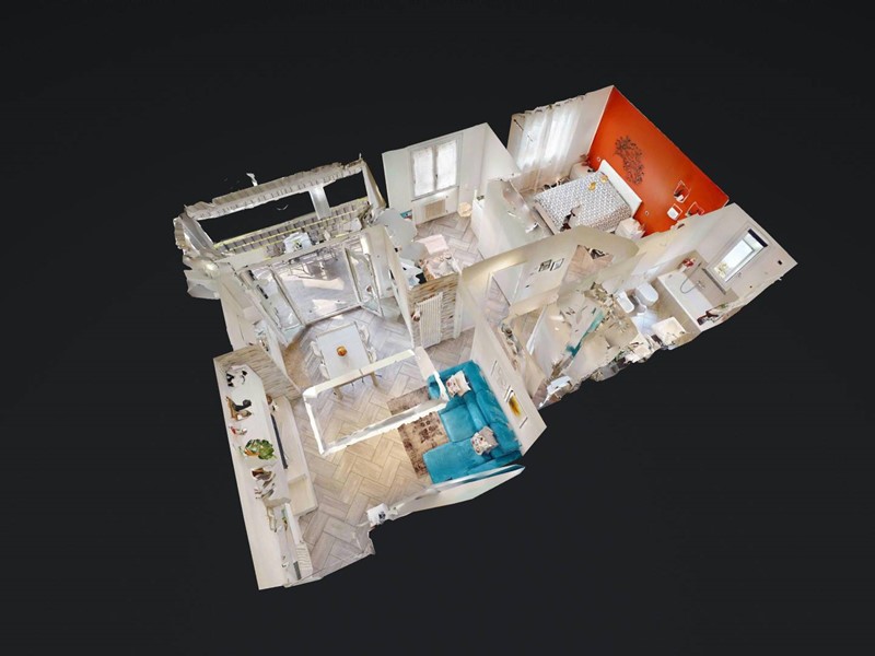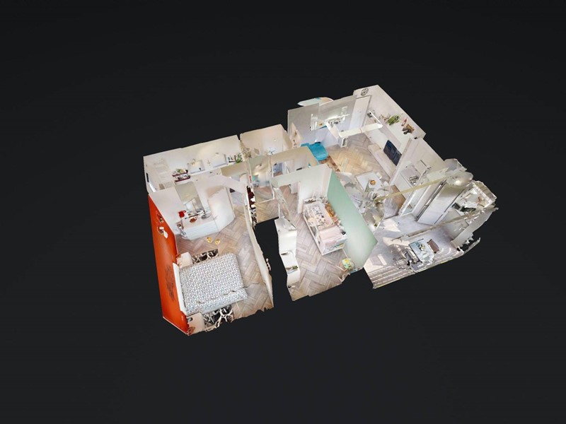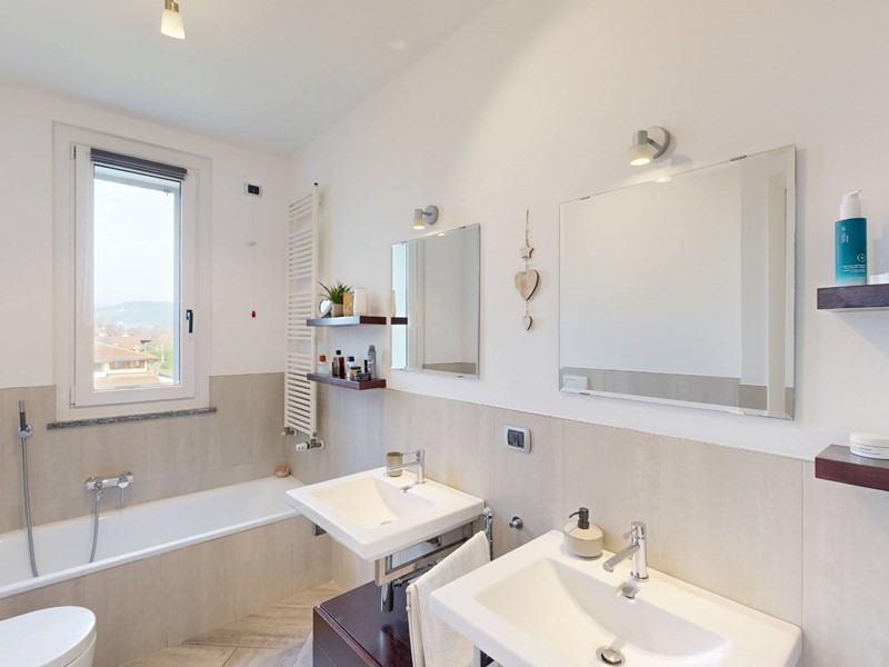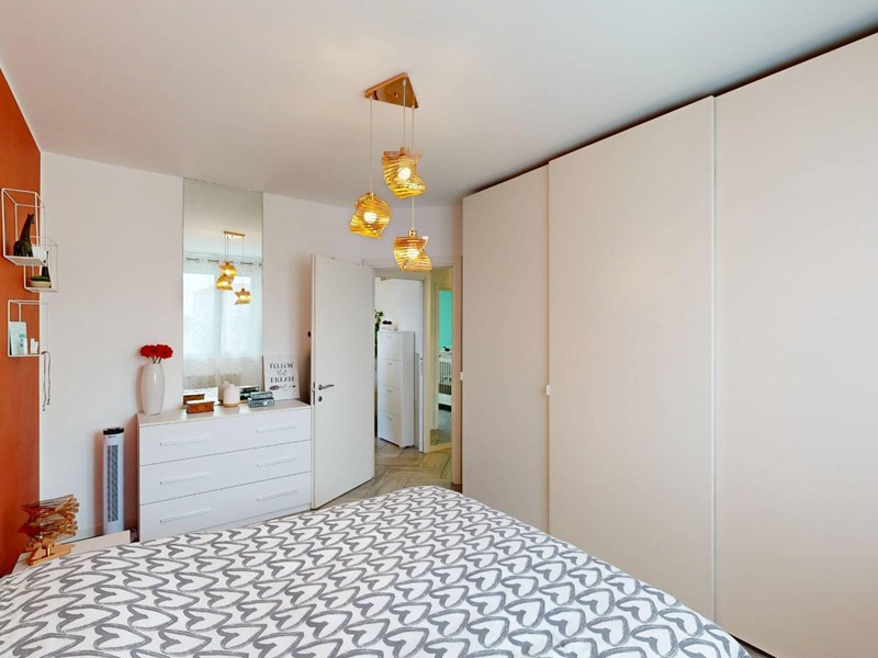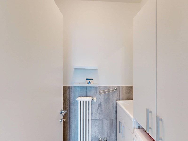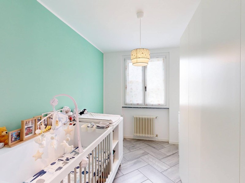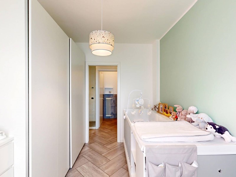 La zona notte è composta da camera matrimoniale, seconda stanza di dimensioni idonee ad uso cameretta o studio e doppi servizi. Il primo bagno è organizzato come locale di servizio con lavanderia, mentre il bagno principale, di metratura più ampia, è dotato di vasca e doppio lavabo.