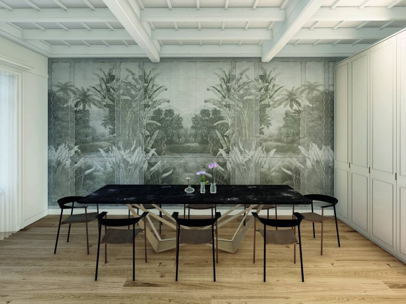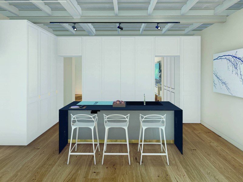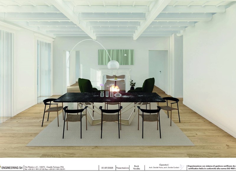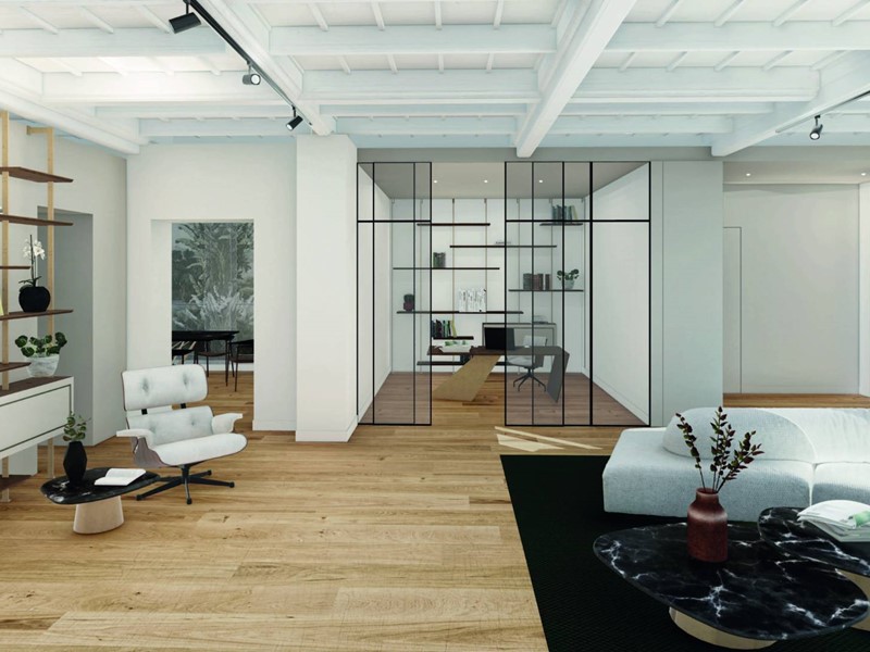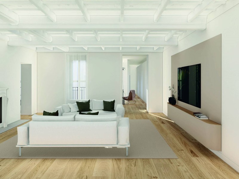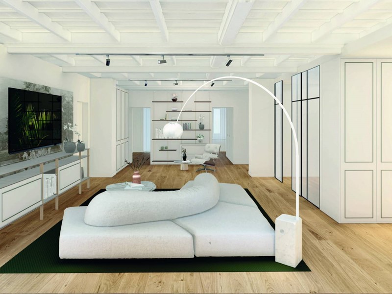 Limmobile si distingue per gli eleganti soffitti a cassettoni, che verranno ridipinti di bianco per valorizzare ulteriormente la luminosità degli ambienti.