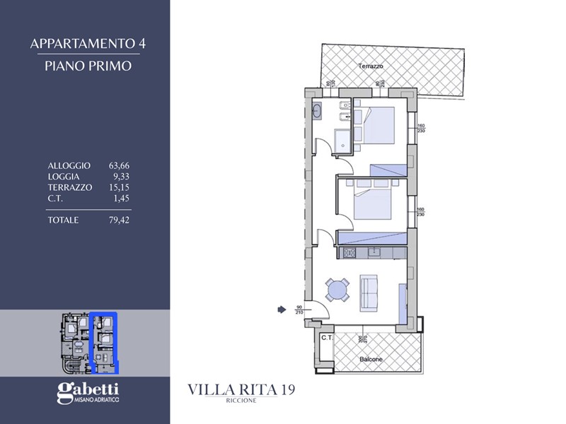 Questo elegante appartamento si trova al primo piano della residenza Villa Rita 19 e si sviluppa su una superficie di circa 79,50mq, offrendo una distribuzione interna funzionale e luminosa.