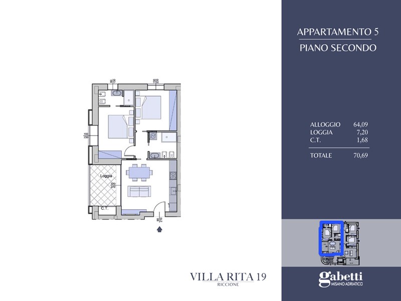 Questo elegante appartamento si trova al secondo piano della residenza Villa Rita 19 e si sviluppa su una superficie di circa 70mq, offrendo una distribuzione interna funzionale e luminosa.