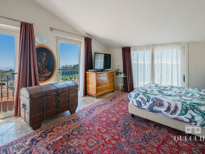 L’abitazione si sviluppa su un unico livello e offre una luminosa e spaziosa zona living con travi a vista, tre camere da letto, di cui una suite con incantevole vista lago, tre bagni e terrazzini panoramici.