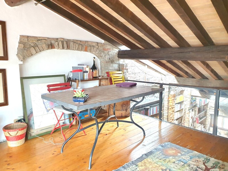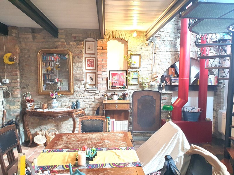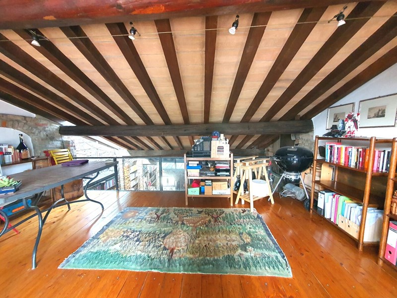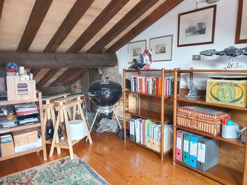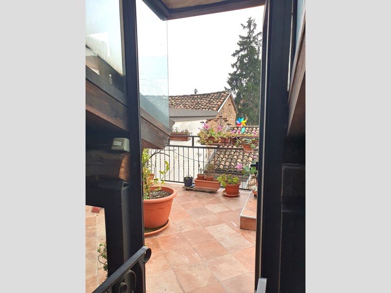 L’appartamento è stato oggetto di una ristrutturazione che ha saputo valorizzare il fascino originario dell’immobile, coniugando elementi rustici e dettagli moderni. L’ampia zona giorno si distingue per i mattoni a vista sulle pareti, le travi in legno a vista sul soffitto mansardato – alto, coibentato e di grande impatto – e un camino funzionante che contribuisce a creare un ambiente caldo e accogliente. Una elegante scala a chiocciola in ferro battuto conduce al soppalco, ideale come studio o area relax, e al vero punto di forza dell’immobile: il terrazzo abitabile.