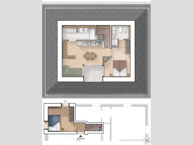 L'appartamento si compone su due livelli, dotato di soggiorno in open space con cucina a vista, due camere da letto, doppi servizi e terrazzo a tasca.
