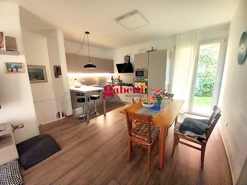 L’ingresso si apre su una zona living dove soggiorno, area pranzo e cucina convivono in un unico e ampio spazio luminoso e armonioso. Da qui possiamo accedere all’esterno dove troviamo un giardino privato di oltre 100 mq ed un portico di 20 mq che diventeranno la vostra oasi per cene al tramonto o colazioni nel verde.