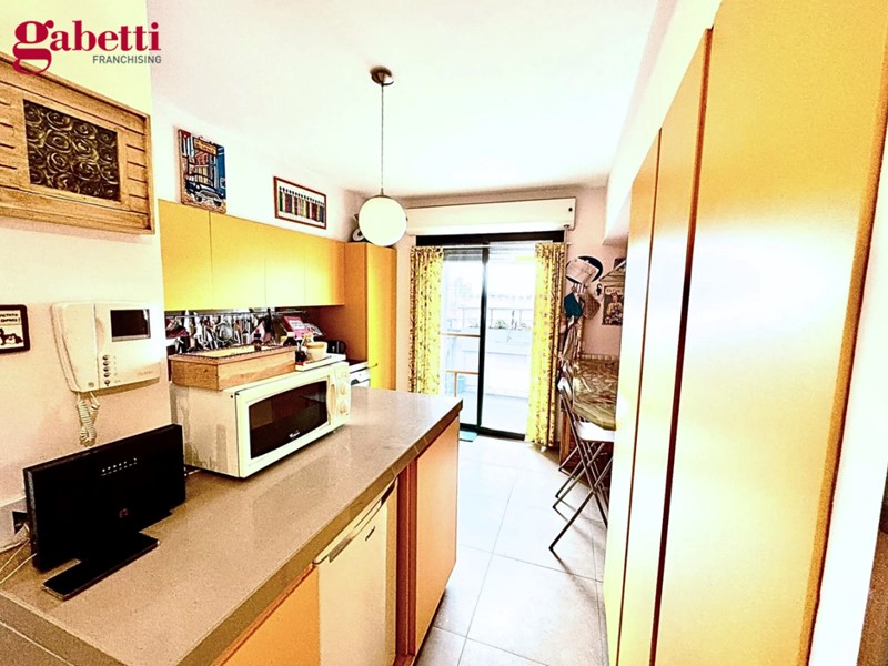 L’ingresso si apre su una luminosa zona giorno, dove l’ampio soggiorno dialoga armoniosamente con l’esterno grazie all’affaccio diretto sul grande terrazzo: uno spazio scenografico e riservato, ideale per cene al tramonto, momenti di relax o per accogliere amici e familiari in un contesto di assoluta privacy. La cucina, separata, garantisce funzionalità e comfort, mantenendo una piacevole distinzione tra gli ambienti.