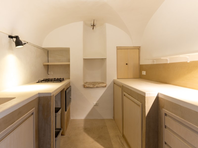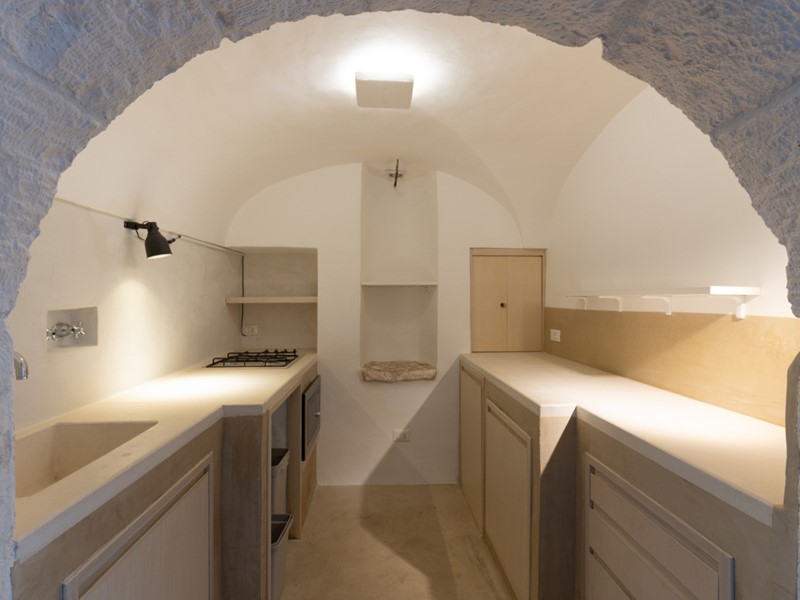 Nel cuore del centro storico di Ostuni, a pochi passi dalla piazza principale, è in vendita Palazzo Petra, un immobile interamente ristrutturato che si sviluppa su due livelli indipendenti, entrambi con proprio accesso e quindi vendibili sia come unica residenza sia come due soluzioni separate. La proprietà, caratterizzata da murature in pietra e ambienti finemente ripuliti e rifiniti con pitture bianche, è composta in totale da due camere da letto, due bagni, due zone giorno con cucina e un balcone panoramico con affaccio verso il mare. Il livello superiore, al piano strada, presenta spazi più lineari e luminosi, con pavimenti decorati originali in cementine e volte alte a stella che donano grande respiro agli ambienti. Qui si trovano una zona living-pranzo, una camera da letto con affaccio sul balcone panoramico, un bagno e una cucina dal design minimale ma funzionale, in muratura e legno chiaro. Al livello inferiore, collegato anche da scala interna, l’atmosfera cambia e diventa più raccolta e tradizionale: le superfici sono quasi interamente in pietra, gli spazi si articolano tra archi e nicchie, e il soggiorno è arricchito da volte a botte e da una pavimentazione in pietra naturale. Qui si trovano inoltre una seconda camera da letto, un bagno ed una cucina anch’essa realizzata su misura, con banconi in pietra e dettagli artigianali. Un elemento di particolare pregio è la presenza, in una delle stanze, di una vasca scavata direttamente nella roccia, testimonianza autentica dell’architettura storica locale. Entrambe le unità sono state ristrutturate con criteri di sobrietà e coerenza, mantenendo la pietra a vista laddove più significativa e privilegiando un arredo minimale che esalta i volumi e la luminosità degli ambienti. La posizione centrale, unita alla doppia conformazione indipendente, rende Palazzo Petra ideale come dimora privata di charme, come investimento per attività ricettiva o come soluzione modulare da vivere e gestire in base alle diverse esigenze.