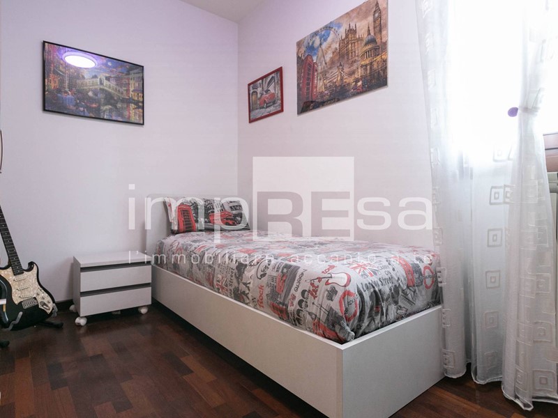 La zona notte offre una camera matrimoniale con terrazzo privato, una cameretta, bagno e disimpegno funzionale.