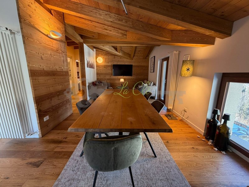 L’ingresso si apre su un comodo disimpegno che conduce a un ampio e luminosissimo soggiorno, arricchito da balconi, camino e da una magnifica vista panoramica sulla Catena del Bianco, con zona pranzo e area living. La cucina è separata e semi abitabile, completamente accessoriata.
