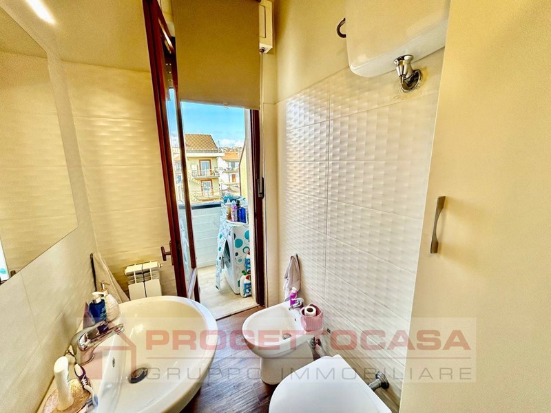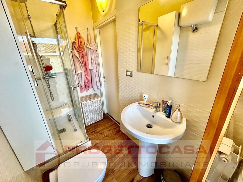 Alla destra dellingresso, il bagno collegato alla camera è dotato di box doccia e si affaccia sul secondo balconcino, dove è presente la lavatrice.