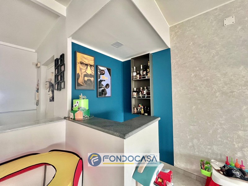la zona giorno è ampia e luminosa, con un soggiorno generoso impreziosito da un elegante angolo bar, perfetto per accogliere amici e familiari.